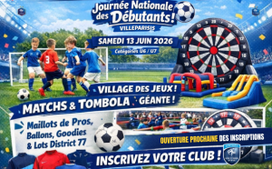 Le District de Seine-et-Marne de Football donne rendez-vous à tous les jeunes licencié(e)s du département pour l’un des temps forts de la saison : la Journée Nationale des Débutants. Samedi 13 juin 2026, Villeparisis Catégories concernées : U6 / U7 & U6F / U9F Cette journée, dédiée aux plus jeun...