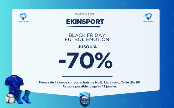 Notre partenaire EKINSPORT vous fait bénéficier dès aujourd’hui du Black Friday Futbol Emotion, avec des promotions exceptionnelles à ne pas manquer.