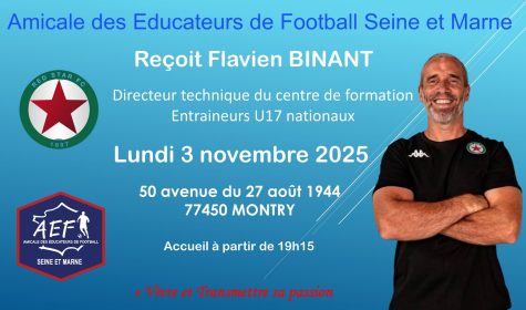 L’Amicale des Éducateurs de Football de Seine et Marne vous propose le lundi 3 novembre une soirée de présentation et d’échanges avec Flavien BINANT.